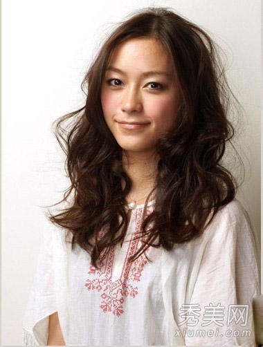 侧分的刘海搭配上蓬松的厚重卷发造型将甜美的感觉显现出来。加上深色的染发造型之后更显肤色的白皙自然。
