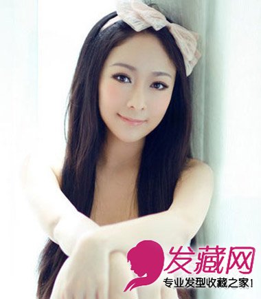 乌黑的长直发简简单单的发型,搭配上粉色的蝴蝶结发箍,简单清丽的造型。