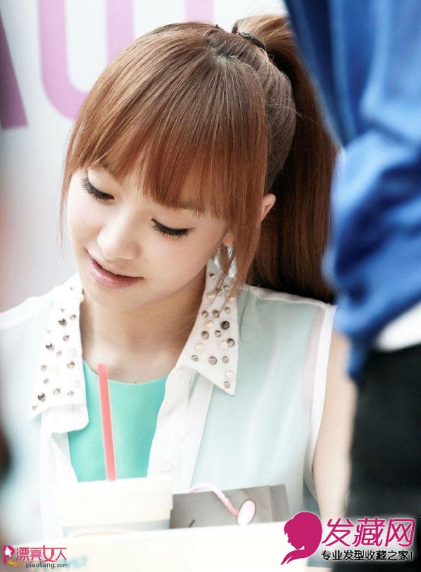 发型点评:扎上低马尾的宋茜瞬间变得活泼甜美,厚重精致的齐刘海修饰额角也是恰到好处。