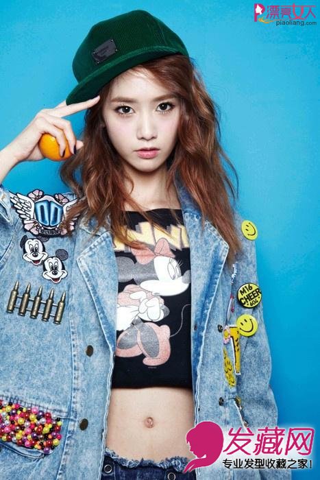发型点评:稍显凌乱的中长卷发慵懒气质十足,染上活力十足的棕色发色,搭配斜搭运动帽,演绎出个性少女风格。