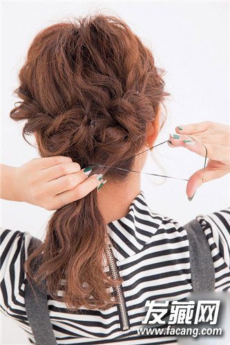 在鬓角部分留出一小束发束,除此以外的头发全部都用发圈扎起来。最后套上装饰发圈。