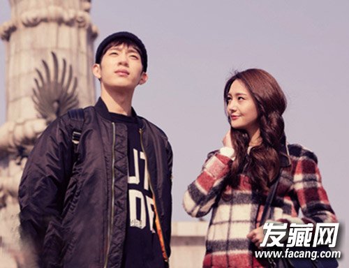 黑色皮夹克的井柏然,柔顺的短发,呆萌帅气,郑爽格纹大衣,柔美栗色卷发,深情款款的望着井柏然,爱意尽显。