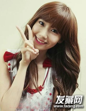 可爱小巧的一款中长发烫发发型, 厚重的刘海发型设计更添可爱与呆萌范, 整个造型清爽甜美而且十分动人。