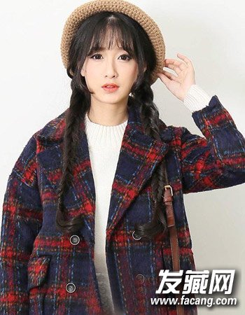 这一款森系风绝对是校园女生的首选 ,甜美的双麻花辫发型加上空气刘海搭配帽子与格子大衣透着无比的青春范,十分讨喜。