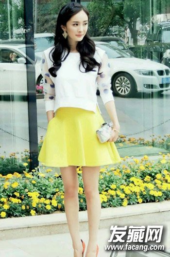 淑女风的发带扎发发型,斜刘海卷发加上蝴蝶节很显淑女气质,黄色短裙搭配大秀美腿。