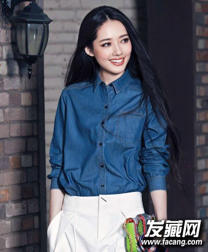 当女神将卷发拉直后,清新气质瞬间满格。顺直的黑色长发自然飘逸,牛仔质地的格子外套更显知性。
