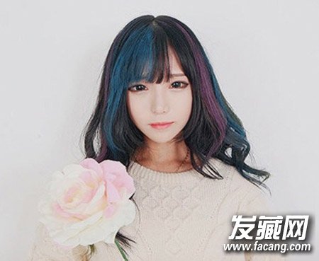 色彩斑斓的卷发在生活中可能很突兀,但拍照片的时候绝对很抢眼,蓝色和紫色挑染相结合,很显梦幻气息,波浪卷发和染发的搭配让发型看起来不是那么非主流。