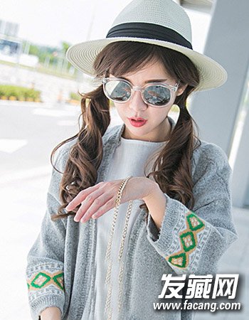 可爱的卷发双马尾扎发发型,斜刘海与双马尾搭配起来显露出个性与时尚的一面来,而且搭配上帽子时尚大气。