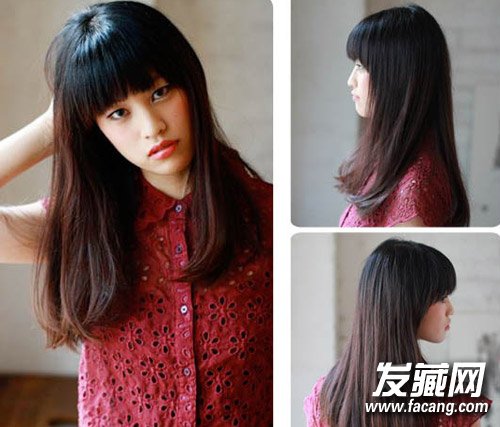 这款齐刘海中长直发,很适合宽脸的女生。可爱的齐刘海搭配垂顺的秀发,可以很好地修饰出精致小V脸哦。