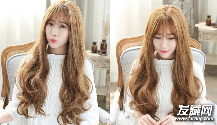 洋娃娃般的一款大波浪中长卷发尽显甜美可爱的气质,出挑的金黄发色加上飘逸的空气刘海,完美地展现了小巧精致的脸型五官,发尾大波浪的卷发十分有立体感,柔顺而动感,尽显公主范。