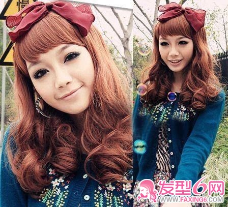 轻薄飘逸丝绸质地的蝴蝶结头饰,与厚重丰盈的蛋卷头搭配,不会出现头重脚轻的感觉,比直齐刘海更具灵活感的C型齐刘海,也很好的平衡了浓密的蛋卷头发尾,让这款发型具有很好的修饰脸型作用,因而人气很高!
