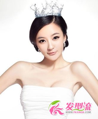 一袭白色的抹胸长裙和经典的盘发打造出女神般高贵,自然黑色系发丝一丝不苟的盘起,打造出光滑的表面,让这款长发发型显得干净利落。皇冠和耳环起到点睛作用,打破呆板,营造出生机。