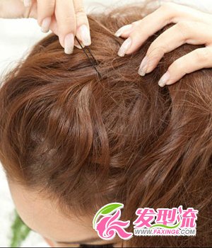 第三步 把发束顺时针扭转固定,用U型夹往后收,就有自然的蓬松感了。