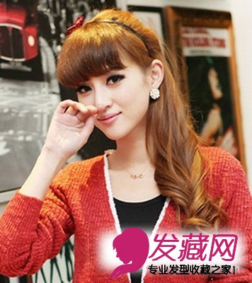 长卷发束起来侧向一边妩媚有气质,而且显浪漫淑女,内扣的齐刘海粉嫩甜美,搭配精美的发箍更加清甜浪漫。