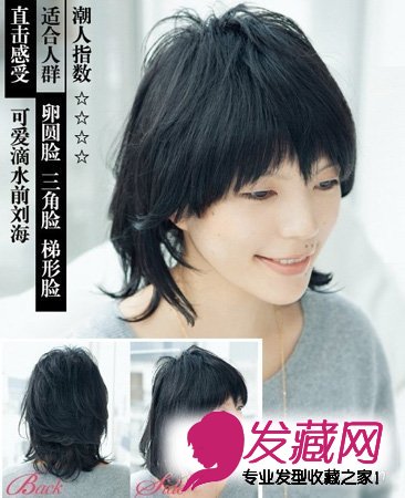 很可爱的一款发型,可以说是“潮”出个性,蓬松的头发直下,给人感觉毛茸茸的,发尾也不是可爱的向发尾中部靠拢。最具有特色的是,在眉心有一簇滴水状的刘海,往往很容易让人留意到眼睛,从中间向两端形成一个特别的视觉,就像冲绳一样给人充满活力,是个性十足的一款发型。