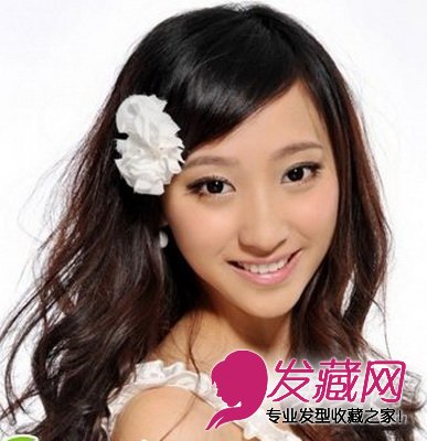 大波浪的卷发发型散发着浪漫的气息,斜刘海利用白色发饰固定在侧边,十分的娇媚可人。