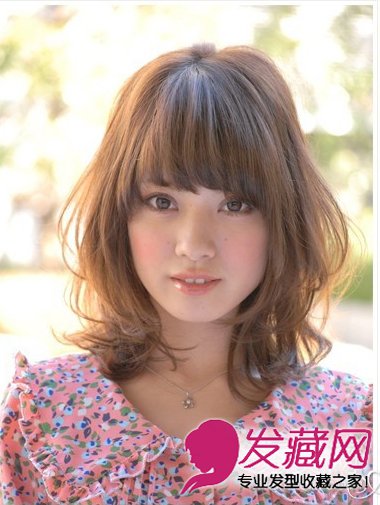 厚重的齐刘海搭配上简单的蓬松发造型,变得自然而修颜。精致的棕色染发将时尚的元素增加,显得魅力散发。