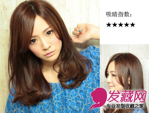 巧克力色头发侧分,发尾微卷显得超级甜美。