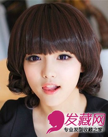 可爱的小女生,顺滑的韩国短卷发型,看起来有种乖巧恬静的感觉,深棕色染发既是清新又显得小优雅,整齐的刘海也瞬间带动萌动的眼睛,十分可爱哟!