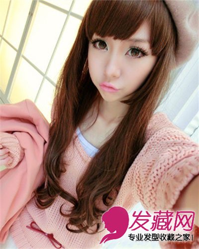 稍斜的刘海,透着小甜美气息,黄棕色的头发,时尚又显肤色,飘逸的大波浪长卷发,超美的,搭上粉色系的帽子和小毛衣,粉粉嫩嫩,特别美。