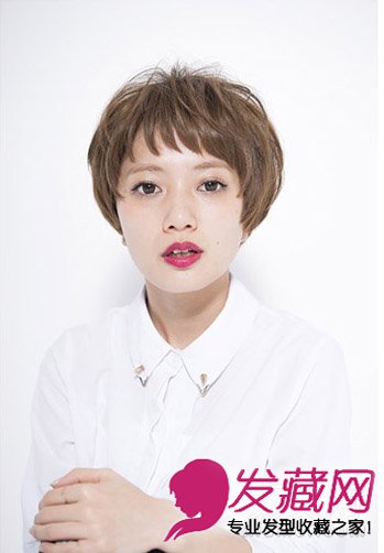 发型点评:这一款短发属于蘑菇头的设计,眉上刘海清爽立体,发束紧紧贴住面颊,修饰出一张绝美小颜。
