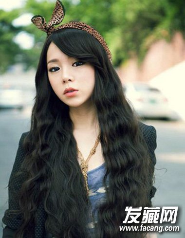 如果妹纸们不喜欢染发发型的话完全可以做上这样一款清新自然的长卷发发型,同样是及腰式的清新乌黑长发,而配合时尚的韩式水波纹烫发造型与微微偏分的造型设计,头顶一个简单的蝴蝶结发箍更为小女生的温柔甜美风。