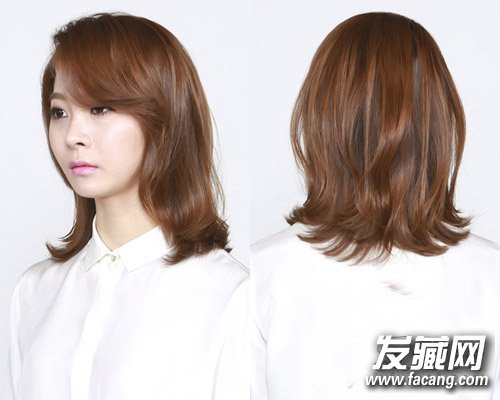 这款发型的线条十分柔美,头顶的厚重与发尾的轻盈形成对比,刘海末端稍稍卷翘贴合脸型显得心机。