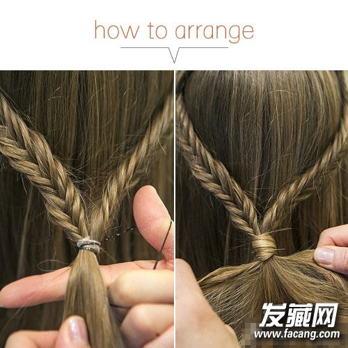 STEP 5:把两边的鱼骨辫在中间用皮绳固定。