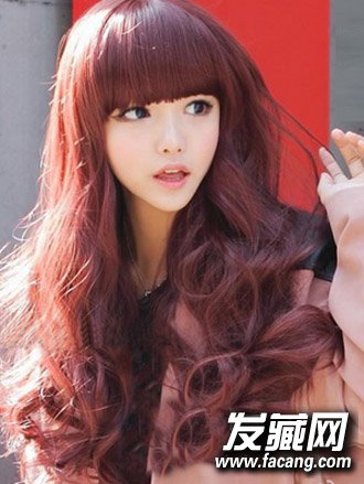 甜美的平刘海发型与蓬松的大卷发型的设计勾勒出别致的时尚感来,而且气质的长卷发被打造出红棕色染发的效果不仅时尚而且整个造型显得颇有时尚感。