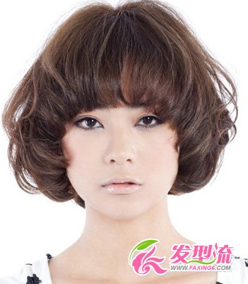 较为独特的一款短发,发尾紧贴轮廓包裹脸型,丰盈的发丝令头型更显。在发梢处做出卷度增加蓬松感,让造型更加立体。搭配齐刘海从视觉上缩小了面积,掩饰肉肉脸。也可以利用一些彩妆品来达到塑造小脸的效果。