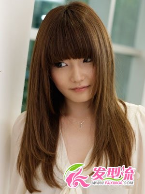 柔美的直发发型是许多女生的最爱,利用稍显厚重的齐刘海制造出瘦脸目的,搭配轻软发质的长发效果绝佳。浅色系亚麻色挑染令发型增加了几分生命力,发尾上细微的层次感修剪,突破了长直发往日的沉闷感,带出一丝动感。