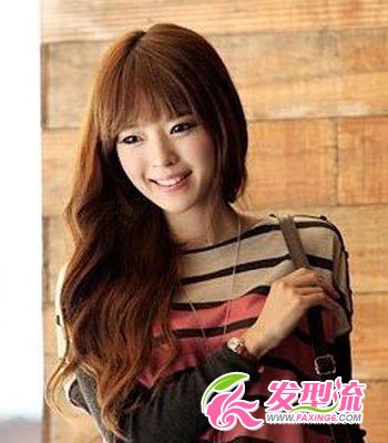 平刘海+侧肩发 齐眉的平刘海,也是修饰脸型的一大妙招,尽显小女生的可爱甜美气息,减龄必备发型。波浪式长卷发洋溢着浪漫唯美的梦幻气息,把发丝全部拢到一侧形成侧肩发,带出妩媚感觉。