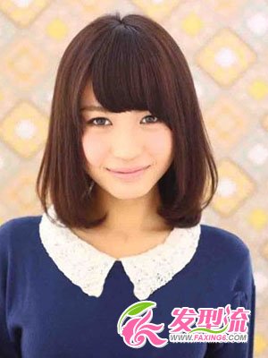 淑女风范的中长发发型看上去独具学生风味,很有减龄效果的一款女生发型!齐锁骨处的秀发打造出柔顺厚重的感觉,齐刘海微微的分开,露出女生好看的双眸!带有笑意的眼眸看上去别具一格,搭配蓝色外翻领的服饰,清纯至极!