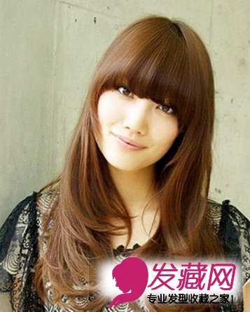 厚重齐刘海时尚又显嫩,发尾一弯一弯地搭在胸前,给人一种很梦幻的feel,就像童话中的公主一样甜美。栗色在阳光下看起来很温暖柔和,而且还给人一种高贵雅致的感觉。