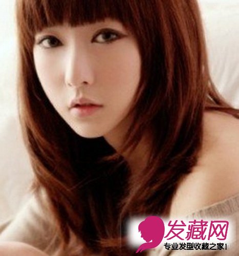 中长发发型人气持续爆涨,层次感十足的修剪,衬托出小脸MM的精致脸型,让五官更显立体。棕色系染发低调适合性格含蓄的MM,齐刘海显现出一双电力强劲的美丽眼眸,在你回头的瞬间让许多人都无法抵挡哦!