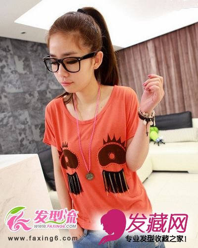将自己的长直发在头后部扎成一个高高的马尾发辫,顺直的长发带着飘逸和灵动感,无刘海的设计,露出光洁的额头的同时,增加了女生的活力。