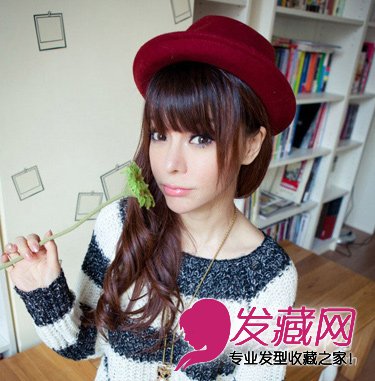 大波浪卷发营造时尚成熟气息,动感的卷发放在一边,清新的刘海戴上礼帽,立马变得更加甜美起来。