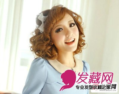 可爱的短卷发,刘海处的卷发处理很有个性,甜美韵味自然体现出来,短发整体不规则烫卷,打造出蓬松凌乱的效果,更具有有立体造型感,金棕色的染发衬托出红润白皙的肌肤,搭配蝴蝶结发饰更显萝莉。