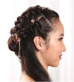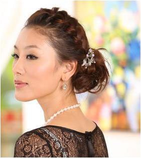 可如图中女主角一样在头顶处适当作些编辫处理,再把头发在头右侧盘起来,拉些发丝做出蓬松效果。再配以闪亮的发夹和耳饰,显得时尚优雅,魅力逼人。这个造型非常有特色,熟女的万千风情展现的淋漓尽致。