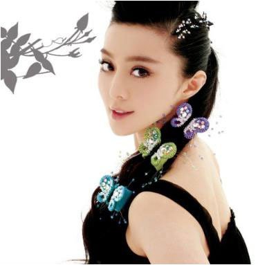 范冰冰是标致的瓜子脸,瓜子脸适宜留中长发或长发。可在头顶做些有层次感的发型处理。图中冰冰将浏海做了一个高高的猫头,然后将后面梳成马尾辫。点缀五颜六色的蝴蝶发饰,360度都可以体味到她的动人气质。这款造型是冰冰给流行美代言的图片,据说这些蝴蝶夹当年可是热卖呀。成熟或可爱,冰冰都能吸引无数目光。