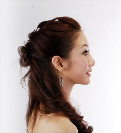 如图片中的女主角将头发一层层往后梳,然后在脑后盘出花朵形状的圆髻,两缕卷发 落在胸前,整个人看起来优雅别致。女主角还为自己选了两个精致插针,大家在盘头的时候一定要选一些配饰,不然会显得很单调,建议选择流行美发饰的品牌店购买,可以享受免费盘头的服务。