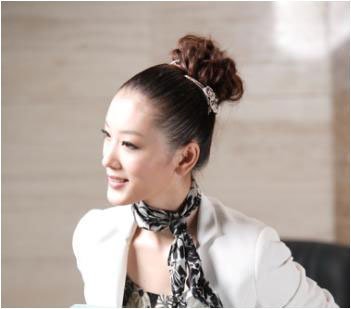 再来讲一款职场女性必备的发型和妆容。职场女性要显示出干练和优雅气质,一丝不苟的盘发 是最合适的。如今追求时尚美丽的熟女们可不再选择以往老气横秋的盘发了。如图中女主角,将头发高高盘起,露出光洁的额头,再戴上镶嵌施华洛世奇水晶的发饰品,点缀黑白相间的丝巾,显得精明干练,优雅迷人,这样的职场丽人,哪位男士不心动呀。