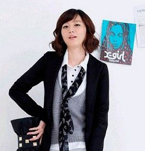 甜美的齐刘海很可爱,这位韩国MM装嫩功夫一流喔!同样的齐发尾卷发,颇有梨花头 的味道呢。即使是黑发也不会显得很老气。此款发型在成熟中透露甜美,很适合轻熟女!