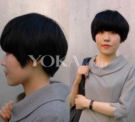 高颧骨的发型还是建议用蘑菇头来做修饰。显得特别的饱满,把上面过窄的缺陷给补充上了。