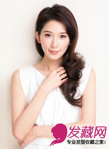 将自然长卷发简单在一侧盘成发髻造型,优雅而利落,更性感迷人。