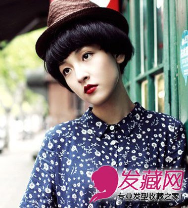 向瓜子脸MM推荐的一款夏日清凉日系短发发型,蓬松的齐刘海蘑菇头短发,侧耳修剪弧度发丝,搭配可爱的小圆帽。碎花衬衫加浆果色红唇,浓郁的复古气息。