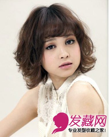 发型点评:这款烫发发型蓬松卷曲,齐肩的长度烫成蓬松的造型,非常乖巧可爱,两侧卷发的弧度很好地中和方脸的棱角,刘海也烫卷成内扣的弧度,以柔克刚让脸型看起来非常可爱。