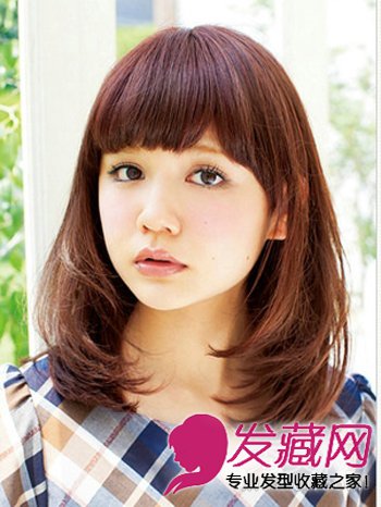 小编点评:偏红的棕色染发把女生甜美如芭比的妆容展现得淋漓尽致。内扣的饱满齐刘海与微卷的中长发华丽优雅,使女生看上去像一个令人垂涎欲滴的苹果般灵气逼人。