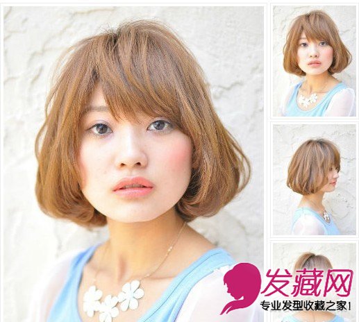 内扣短发发型图片染出浅棕色的染发,将侧刘海剪出碎发的造型轻盈十足。简单的内卷式梨花头造型尽显出娇小的修颜效果。