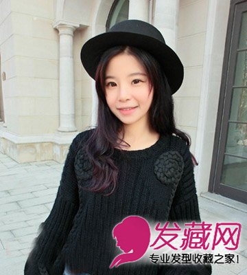 偏分的斜刘海自然滑过脸颊,突出精致水润的大眼睛,柔顺的秀发搭在两侧肩上,打造出精致的小脸美女。搭配一顶黑色的小礼帽,更加甜美俏丽。